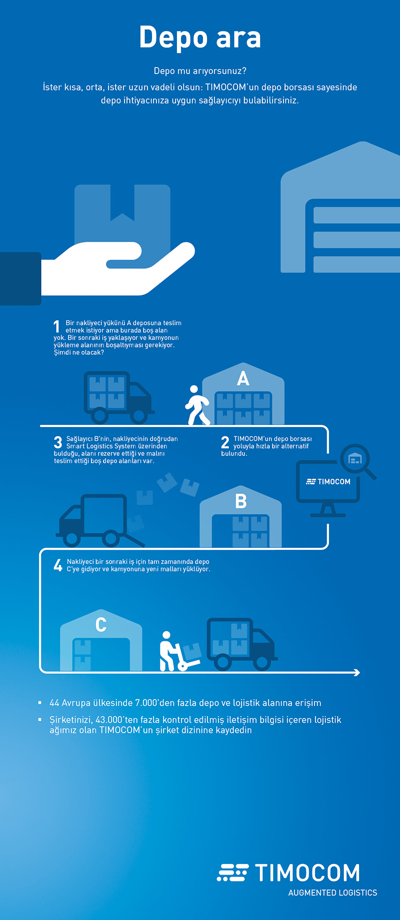 Bir deponuz var ve bunu optimal olarak doldurmak mı istiyorsunuz? Ya da uygun depo alanları arayışında mısınız? Öyleyse size uygun çözüm bizde: Smart Logistics System’imiz içerisinde bir depo borsası da sunuyoruz. Bu sistem, Avrupa’da farklı depo alanları ve türleri açısından açık ara en büyük B2B ağıdır, üstelik ek maliyet olmadan. Sistemin kullanıcısı olarak depo borsasına ve potansiyel olarak 46 Avrupa ülkesinden 9.000’den fazla depo ve lojistik alanına otomatik olarak erişebilirsiniz. İhtiyaca bağlı olarak depo teklifleri alabilir ya da ilan edebilir ve potansiyel bir iş ortağıyla bağlantı kurabilirsiniz.